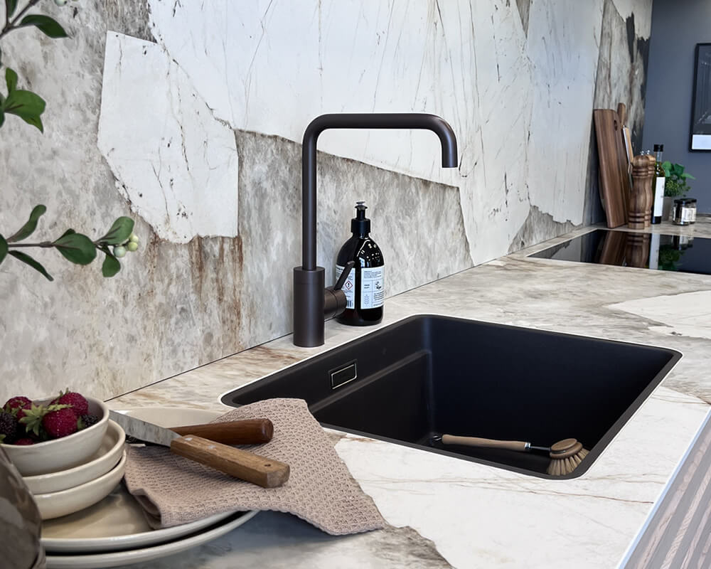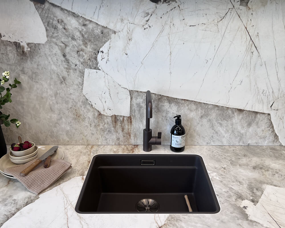 • Bemærk at enkelte nye opvaskemaskiner kræver alufolie under naturstensplader. Dette følger ikke med bordpladen.