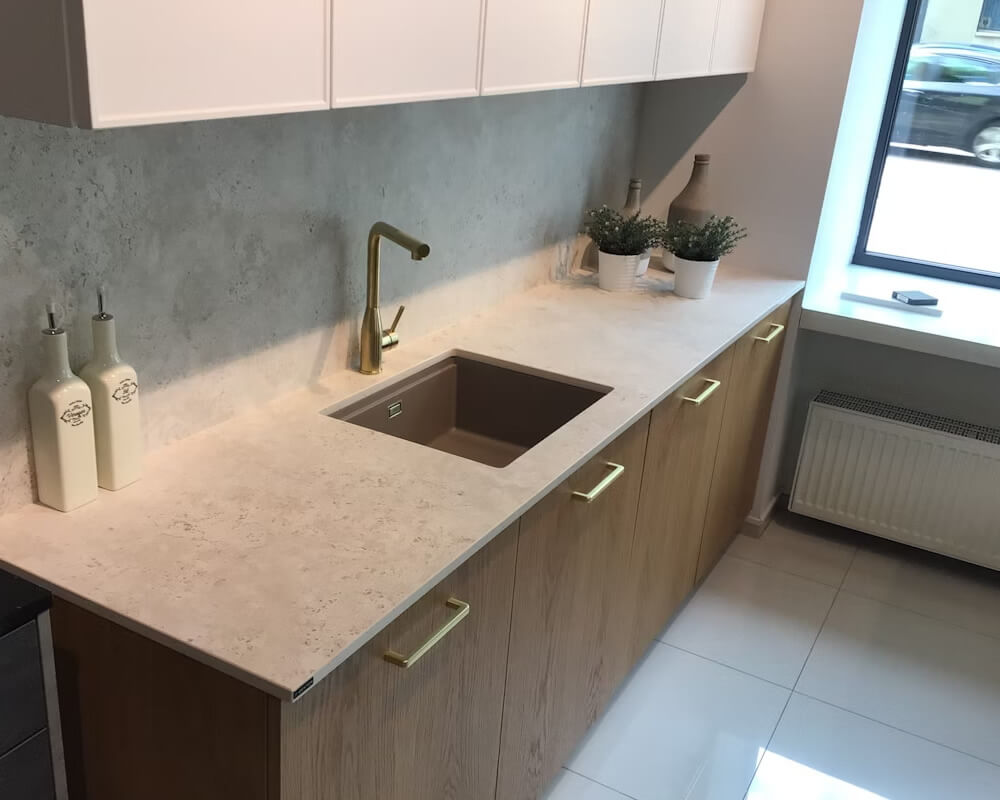 Naturligt farvespil med inspiration af italiensk travertin. Flot åremønster, og harmonisk overflade med nuance variation.